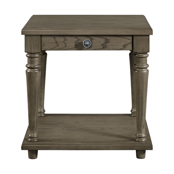 The Kings Court End Table is a stylish and functional addition to your living room or bedroom. Constructed of durable materials including MDF, Rubberwood, and Oak Veneer, this end table is built to last. It features a convenient storage drawer for stashing remote controls or other small items, as well as a bottom shelf for additional storage or display space. The table also includes a USB and power strip, making it easy to charge your devices while sitting on the couch or in bed. Grey metal hardware adds a modern touch to this versatile piece of furniture.