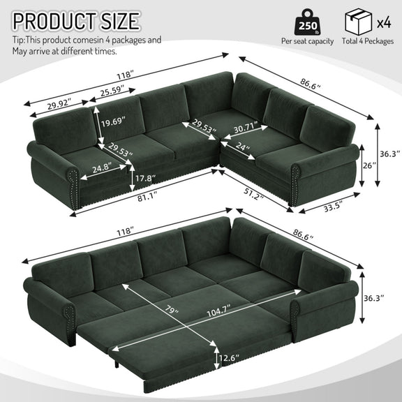 L-Shaped Sofa Couch With Pull Out Bed With Nailhead Trim & Rolled Arm, Sectional Couches, For Living Room - Green