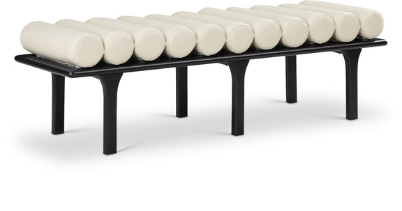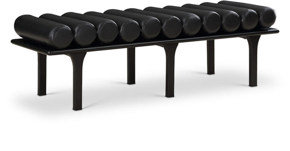 Outfit your foyer, bedroom, dressing room or other area of the home with this handsome Landon vegan leather bench. A rolled vegan leather seat upholstered in vegan leather gives this uniquely designed bench the luxe look of leather without the maintenance requirements. Built to last, this art-deco-inspired bench has a solid oak base finished in sleek black for a beautiful, resort feel in whatever room you wish to use it in.