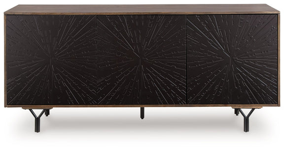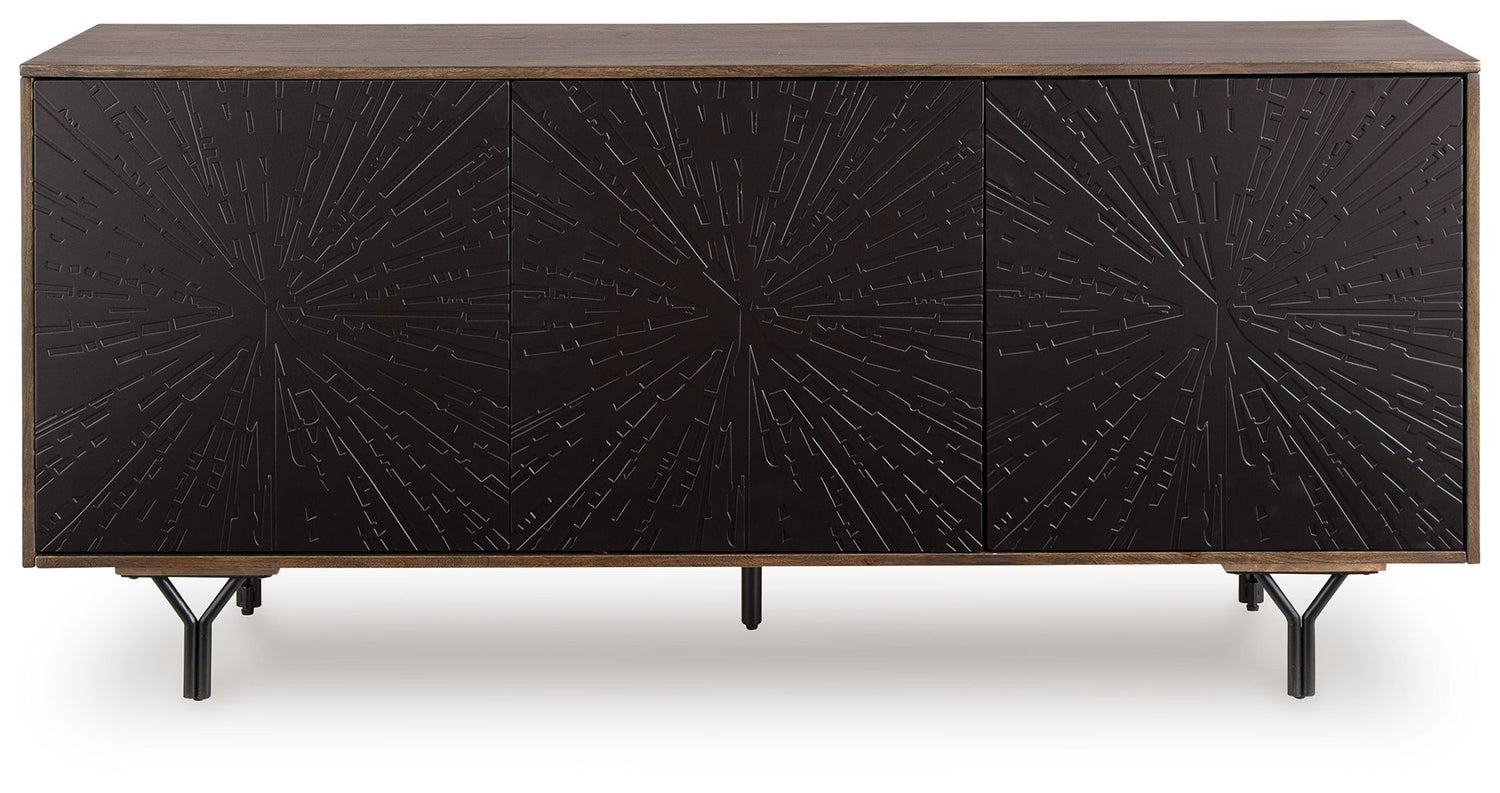 This accent cabinet combines classic function with elevated styling. Its ultra-sleek linear profile channels contemporary aesthetics, with the dark two-tone look lending a luxurious feel. Crafted with stunning mango wood, the carved sunburst pattern reflects superb attention to detail and refined craftsmanship. And for added function, push magnet doors gently open to reveal spacious storage.