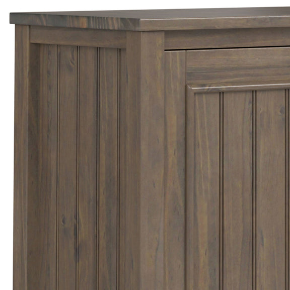 - Transitional design includes grooved detail on front doors, sides, brushed bronze handles, square tapered legs and square edged table top