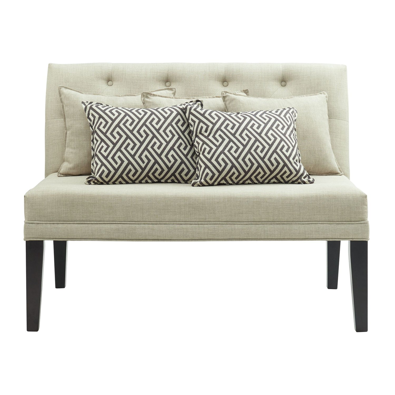 The Maddox Dining Loveseat with Five Pillows takes dining seating to the next level. This piece is fully upholstered in taupe fabric. Three taupe pillows and two grey decorative pillows with geometric designs accent this piece. Button tufting along the back adds extra flair to this already stunning piece. No need to worry about comfortability, as this sofa has foam cushion for the back and seat. Not to mention, the dark wire brush finish of the legs gives great contrast with the taupe fabric. This loveseat seats two comfortably. Add this loveseat to the dining table in this collection for a perfect pairing.
