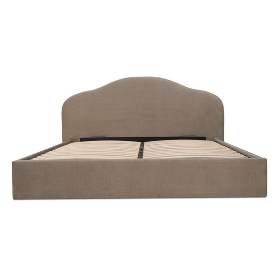 A softer take on tradition. The Maggie Bed reimagines a classic arched headboard with a tapered silhouette and contrasting twisted trim for subtle detail. Upholstered in taupe polyester, the rounded footboard echoes the headboard’s softness for a cohesive look. Beneath the mattress, a hydraulic lift reveals hidden storage, showing how timeless curves can deliver everyday practicality.