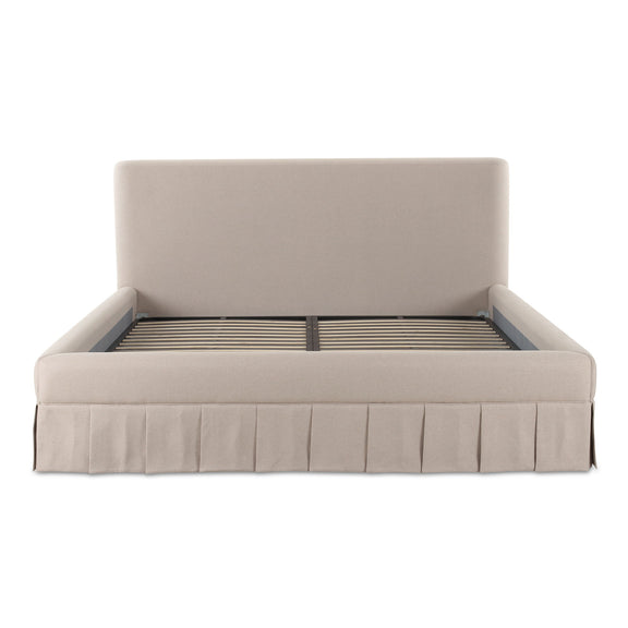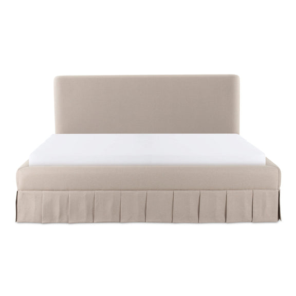 The Maren queen bed exudes a soft, feminine aesthetic, upholstered in a warm, neutral fabric and featuring a playful yet refined box pleat base reminiscent of vintage finesse, straddling the line between contemporary form and traditional finish. With smoothly rounded corners and graceful, curving forms adding softness to the design, this piece is a study in elegance and subtlety.