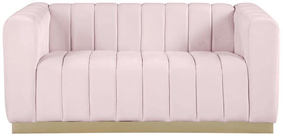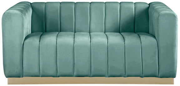 Seat guests in the epitome of comfort and style with this Marlon velvet loveseat. This piece is just the thing to showcase your modish style while ensuring total enjoyment from all who are lucky enough to relax on its channel tufted seats. The soft velvet upholstery adds a beautiful touch to your space and feels great against your skin while the brushed gold stainless steel base lends it a contemporary finish.