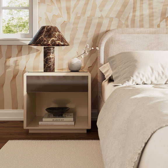 We tapped into the Mocha Mousse trend with the Martha Taupe Mirrored Nightstand. This Art Deco-inspired piece features a sleek metallic taupe finish and a beveled glass surface that adds a touch of glam and easy-to-clean functionality.