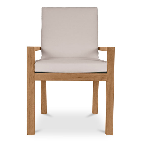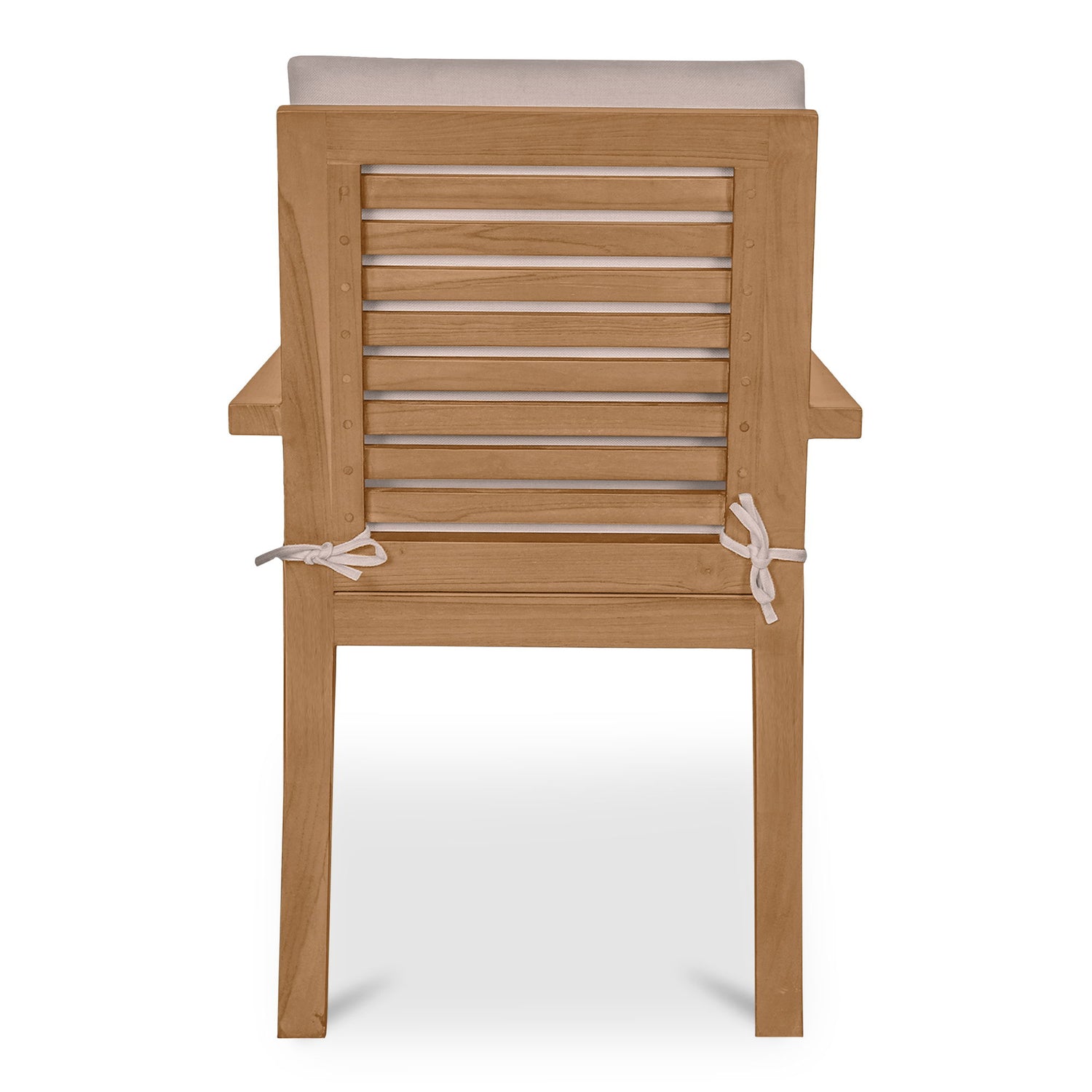 The Mateo outdoor dining chair combines comfort and understated style in the outdoor dining area. This foundational piece features a solid teak frame with quick-dry foam cushions upholstered in white 100% Olefin fabric. The slatted back and simple frame create a timeless look, while cushion ties ensure everything stays in place, making it perfect for a sophisticated patio or garden dining set.