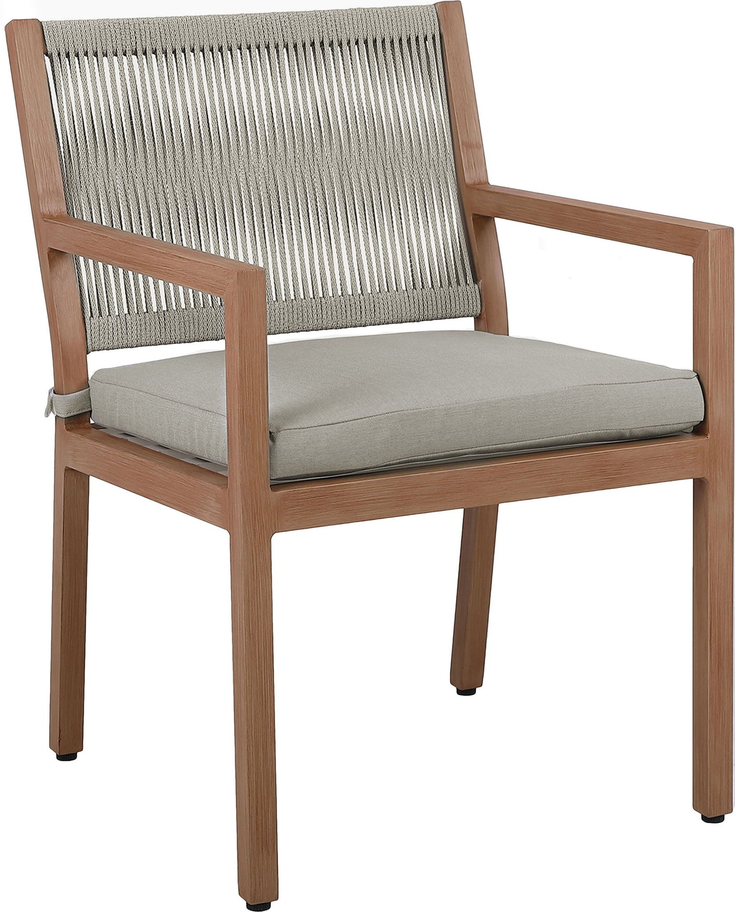 Make your outdoor oasis even more inviting with this Maui Outdoor Patio Dining Arm Chair. Crafted with an aluminum frame to look like teak without the maintenance requirements, this dining arm chair offers both style and convenience. Its resilient fabric cushions are water-resistant and plump and have quick-dry foam inserts. With its contemporary resort look, this chair adds sophistication to any patio, porch, or deck setting. Embrace the essence of outdoor comfort and style with this elegant addition-your perfect companion for leisurely moments outdoors.