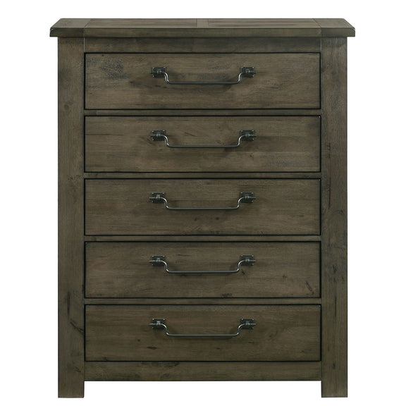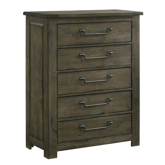 The Maverick 5-Drawer Chest in Grey delivers rustic and cozy style to your sleeping space. Features distressing and wood grain detailing throughout for that warm feel. Constructed of sturdy solid and manufactured woods for years of use. Perfect neutral finish for adding to your existing bedroom aesthetic. Complete the look by adding the Maverick Panel Bed to your bedroom.