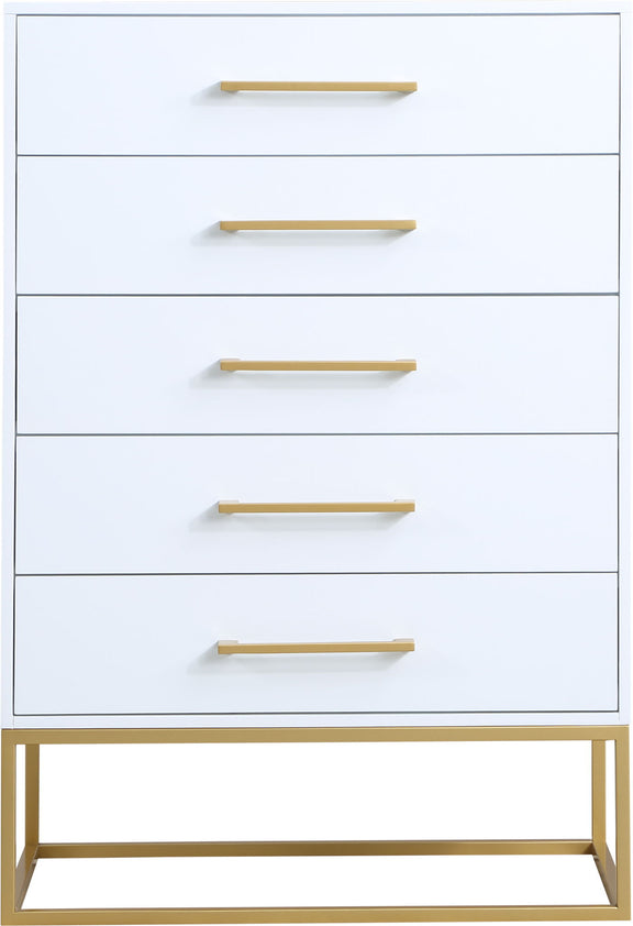 Inject bold, modern styling into your bedroom with this Maxine chest. The chest's contemporary design is nothing short of stunning, with unassuming lines and eye-grabbing hardware. A rich finish is modish and up-to-the-minute, while the brushed metal legs and drawer handles give this unit added flair. A metal base raises the chest from the floor for a noticeably upscale vibe. Fill this chest's drawers with essentials for keeping your bedroom space clean and neat.