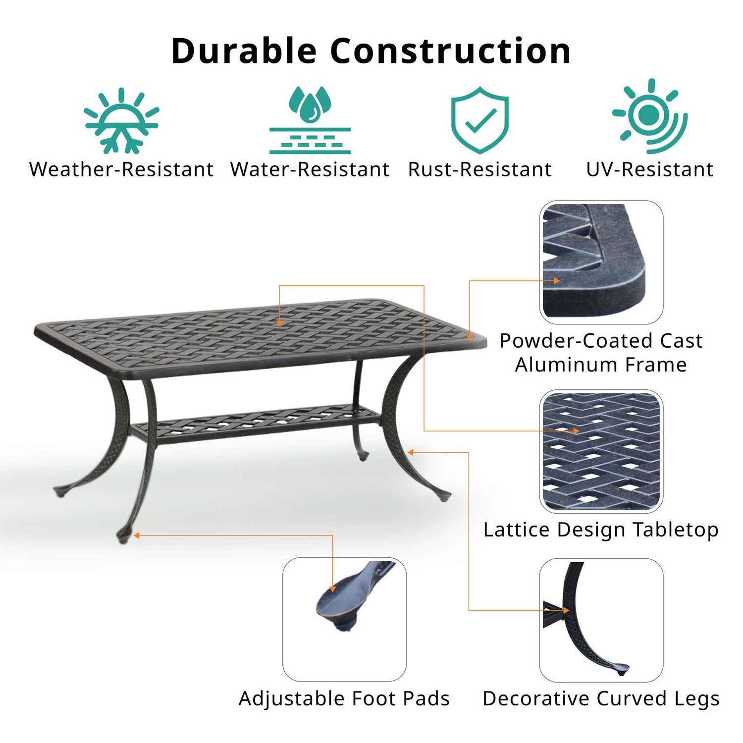 • Hassle-free maintenance: The cast aluminum patio table requires minimal upkeep, needing only a wipe with a damp cloth for dirt or cleaning with soapy water for stains, ensuring easy maintenance for long-lasting enjoyment.