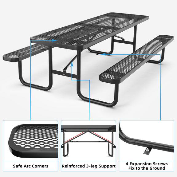 - Stable Steel Frame: The picnic table and chair top are crafted from industrial-strength steel, coated in thermoplastic for durability, and feature galvanized frames with a heavy-duty powder coat finish to withstand harsh weather conditions.