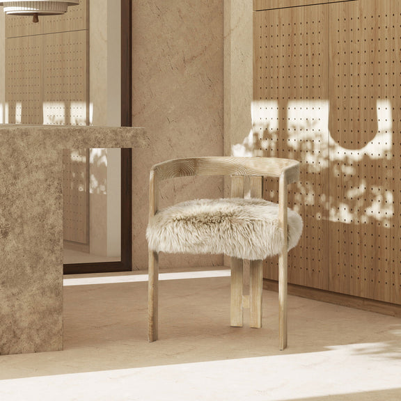 - High-Quality Materials: The chair features a solid ash wood frame with a beautiful natural grain, finished in a blonde rustic tone. The seat is upholstered in genuine sheepskin fur, providing a luxurious and comfortable seating experience.