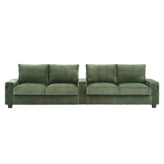 Modern 4 Seater Corduroy Sofa With USB Ports, Hidden Storage Arms, Flip Top Cup Holders - Green