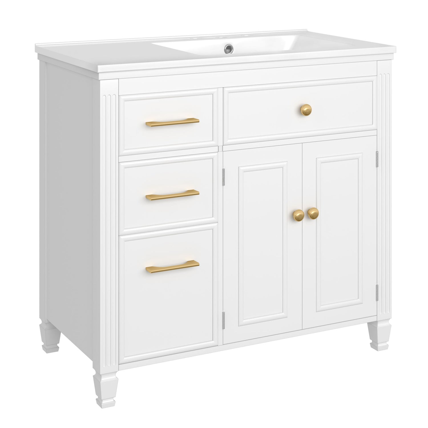 Modern Bathroom Vanity With Ceramic Sink, Freestanding, One Tip - Out Drawer, 3 Side Drawers, Adjustable Shelf - White