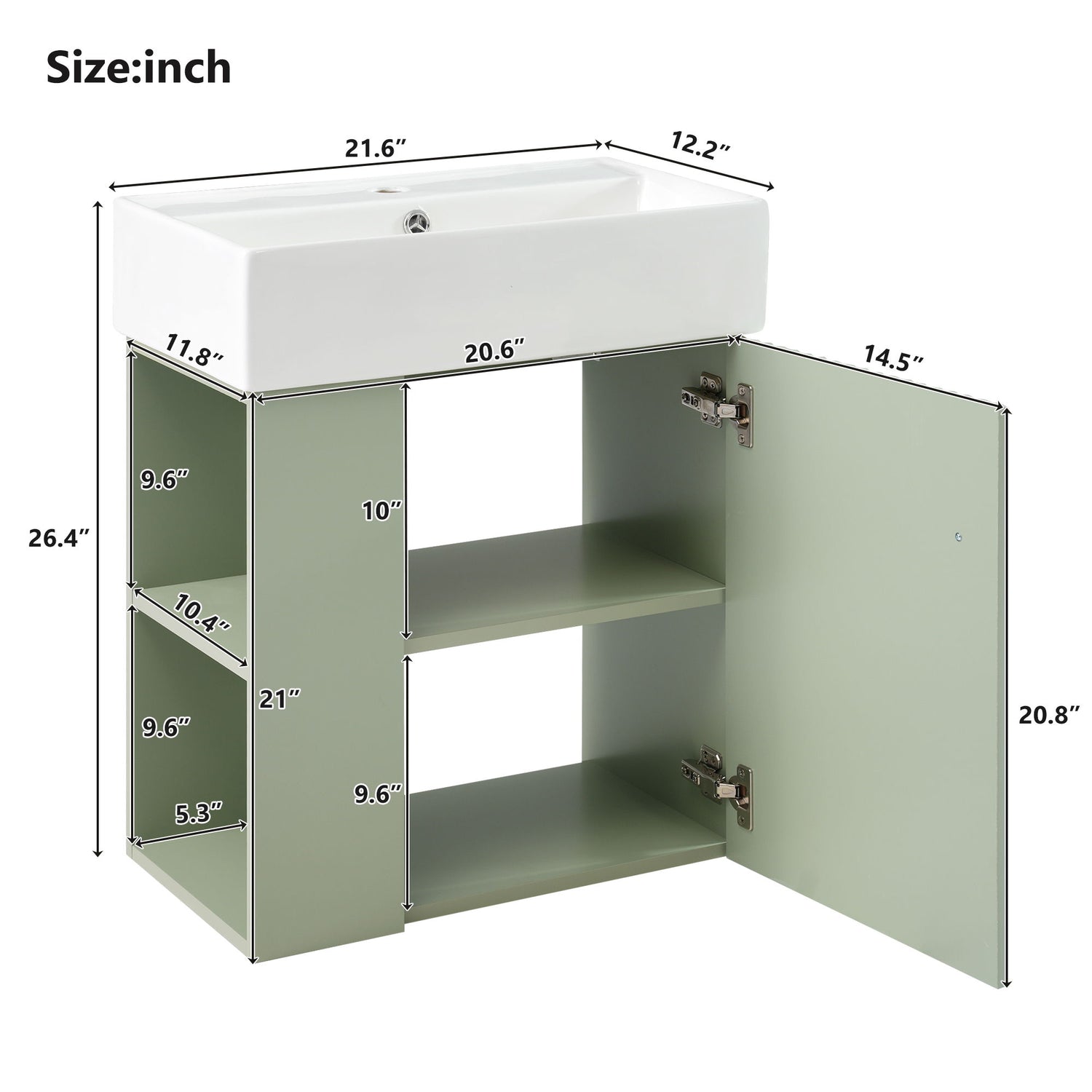 Modern Floating Bathroom Vanity With Ceramic Basin, Perfect For Small Bathrooms, Right Side Storage - Green