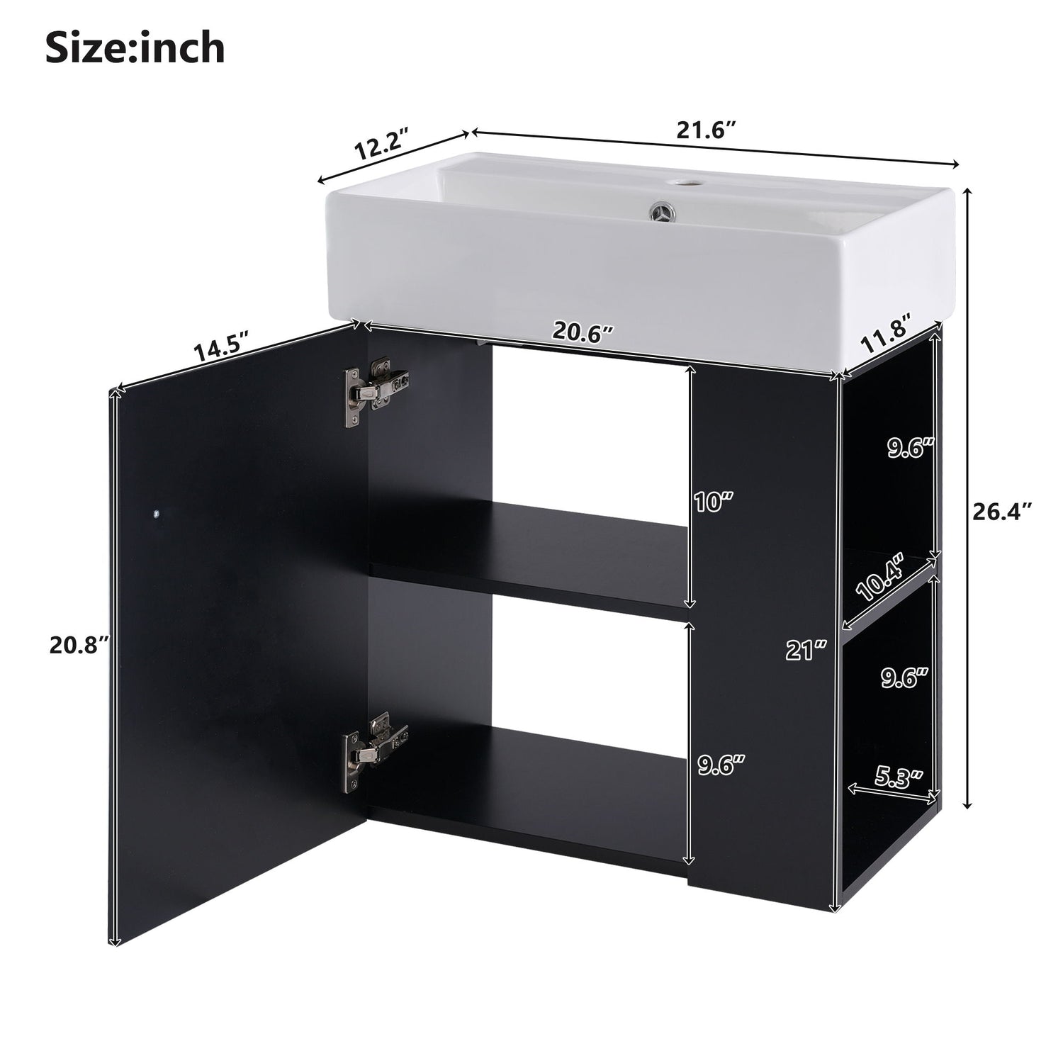 Modern Floating Bathroom Vanity With Ceramic Basin, Perfect For Small Bathrooms, Left Side Storage - Black