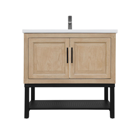 Modern Freestanding 36" Bathroom Vanity With Ceramic Sink, Hot And Cold Faucet, Storage Cabinet & Open Iron Shelf - Natural