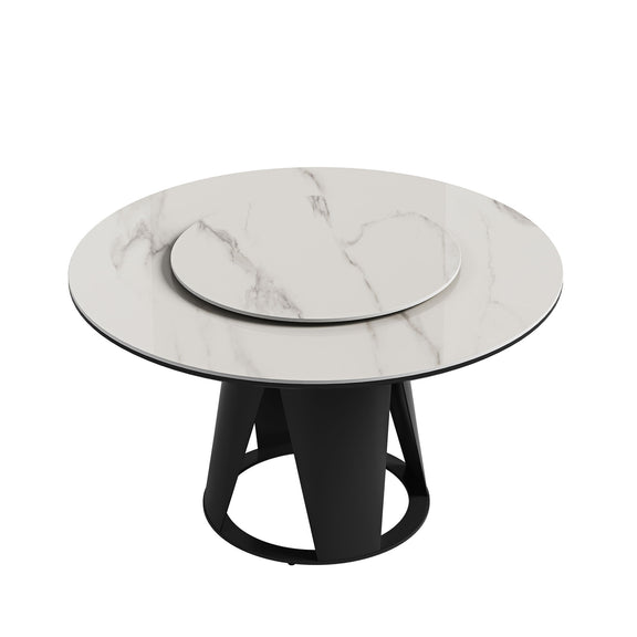 Modern Sintered Stone Dining Table With Round Turntable And Metal Pedestal - White