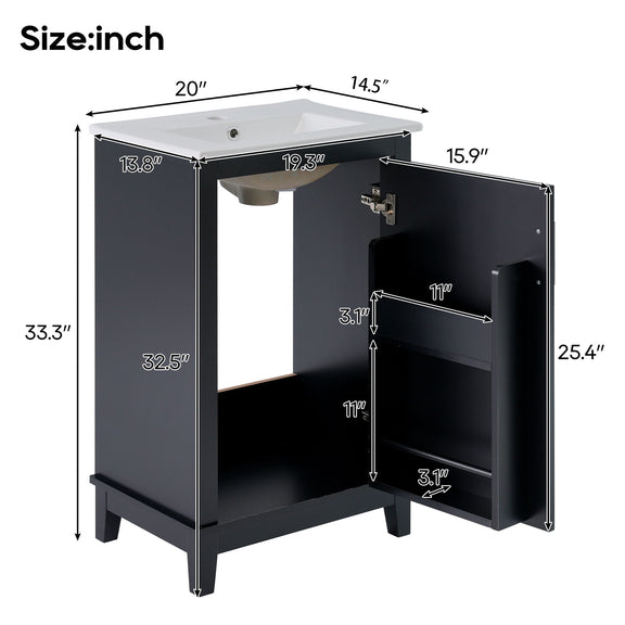 Modern Small Bathroom Vanity Cabinet With Ceramic Basin, Ample Storage, 1 Soft Close Door - Black