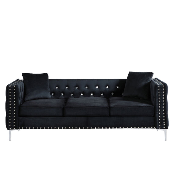 Modern Sofa Jeweled Buttons Tufted Square Arm Couch, 2 Pillows Included - Black
