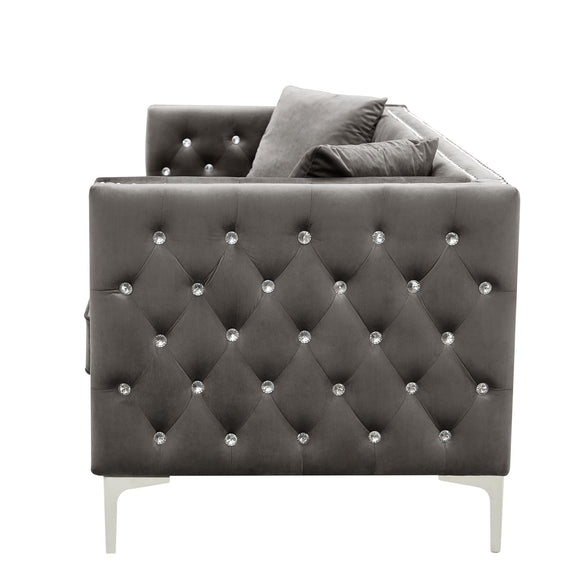 Modern Sofa Jeweled Buttons Tufted Square Arm Couch, 2 Pillows Included - Gray