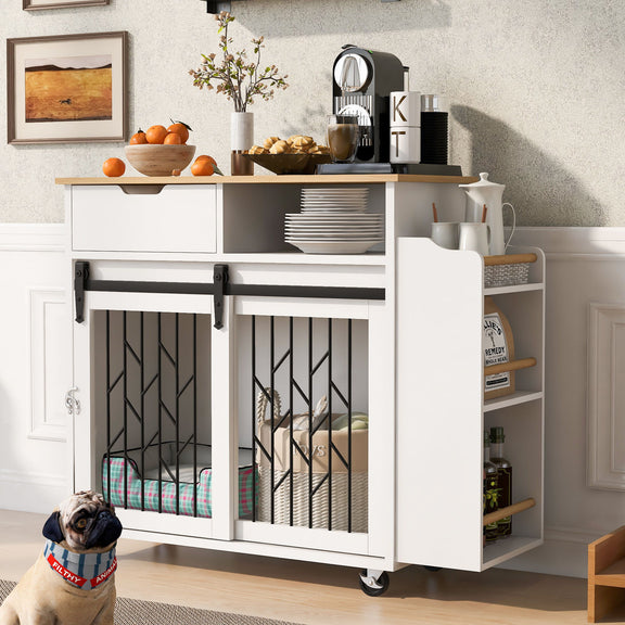 Modern Style 2 In 1 Pet Friendly Dog Crate Kitchen Island End Table Metal Pine - Natural / White