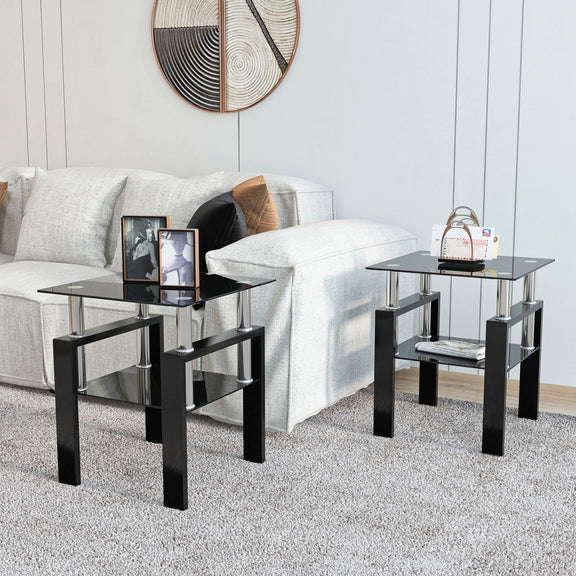 Modern Tempered Glass Tea Table, End Square Table For Living Room (Set of 2) - Black