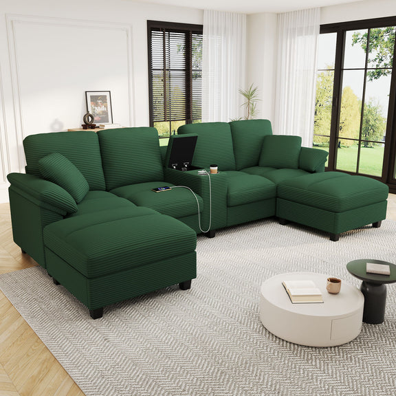 U-Shaped Sectional Sofa, Hidden Storage Ottomans, USB Ports, And Cup Holders - Green