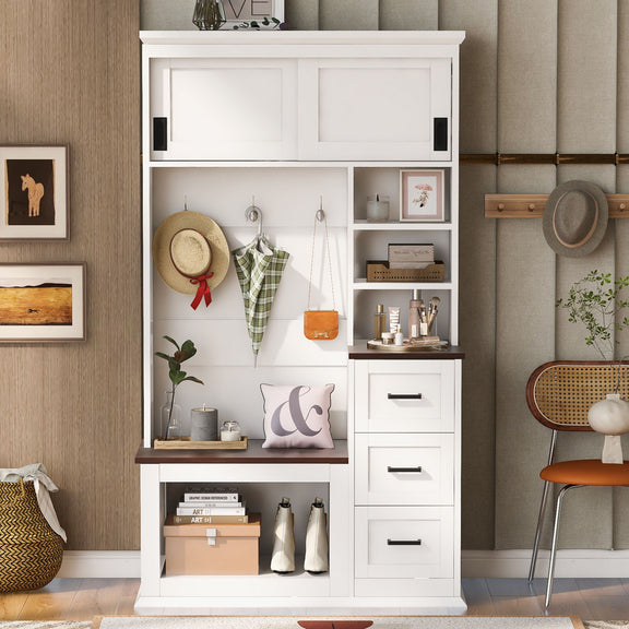 Modern Entryway Bench With Coat Rack, 3 Shelves And Drawers, 3 Sturdy Hooks, Wide Hall Tree With Storage Bench For Hallway - White