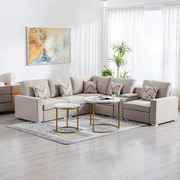 Nolan - 6 Piece Reversible Sectional Sofa With a USB, Charging Ports, Cupholders, Storage Console Table, Pillows And Interchangeable Legs - Beige