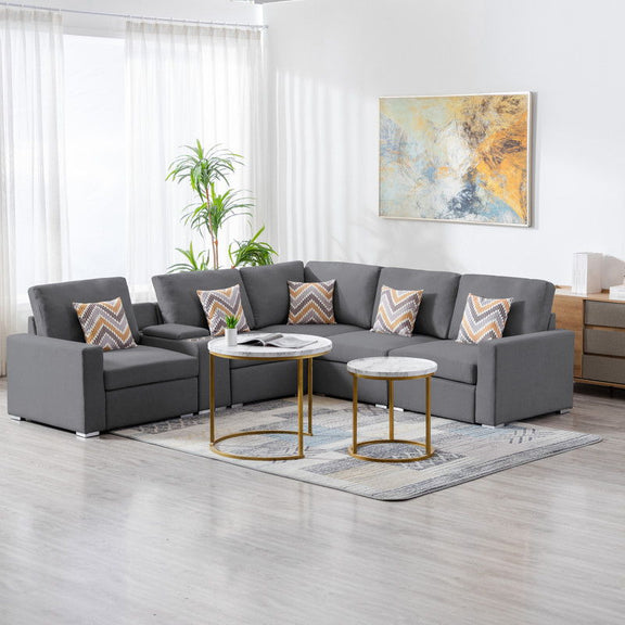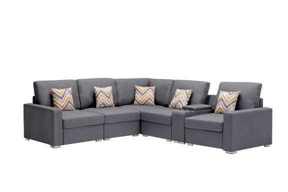 Nolan - 6 Piece Reversible Sectional Sofa With USB, Charging Ports, Cupholders, Storage Console Table, Pillows And Interchangeable Legs - Gray