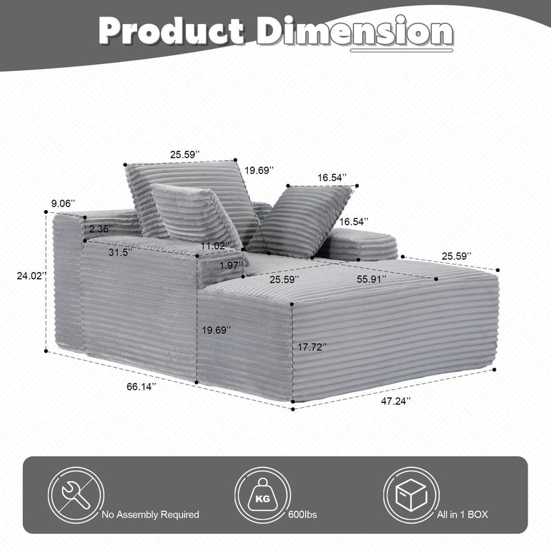 Oversized Chaise Lounge Chair Cozy Cloud Couch, Plush Corduroy Upholstered Sleeper Sofa Daybed With 3 Throw Pillows And Wide Armrest For Living Room - Gray