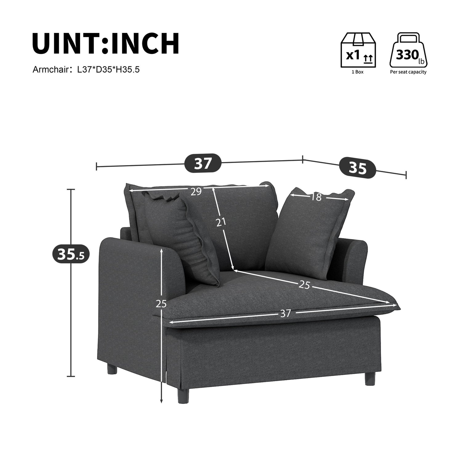 Oversized Single Seat Sofa Module For Modular Sectional Wide Seat, Armchair With Pillows Modern Upholstered Comfy Single Couch Lounge - Gray