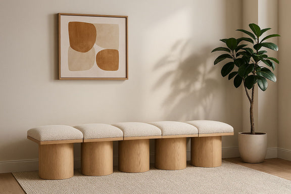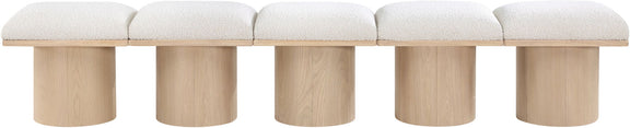 Bring valuable seating and remarkable style to your space with this Pavilion boucle fabric bench, an exquisite balance of style and usability for the entryway, bedroom, and beyond. Crafted from oak veneer with a natural finish, this bench has a 4-inch-thick seat cushion that's channel-tufted for a touch of luxury. The bench's columnar bases add a dash of art deco design, making it a captivating focal point in any room.