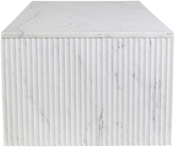 Marble streaked with bold white veining gives the Pienza table a dramatic, gallery-worthy presence. Fluted sides add sculptural depth, while each handcrafted piece offers one-of-a-kind character. Built to impress, this art deco stunner commands attention-just be sure to wipe up spills fast to protect its natural beauty.