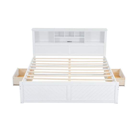 King Size Platform Bed With Multi Storage Headboard, USB And Drawers - White