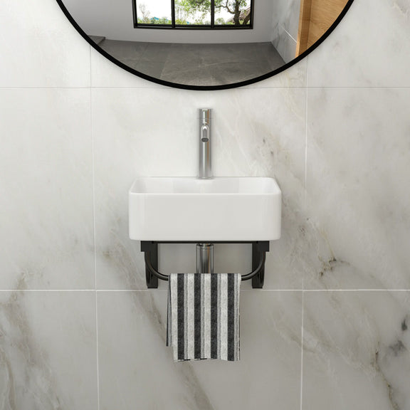 Rectangular Bathroom Sink With Towel Bar & Faucet Hole, Wall Mounted - White