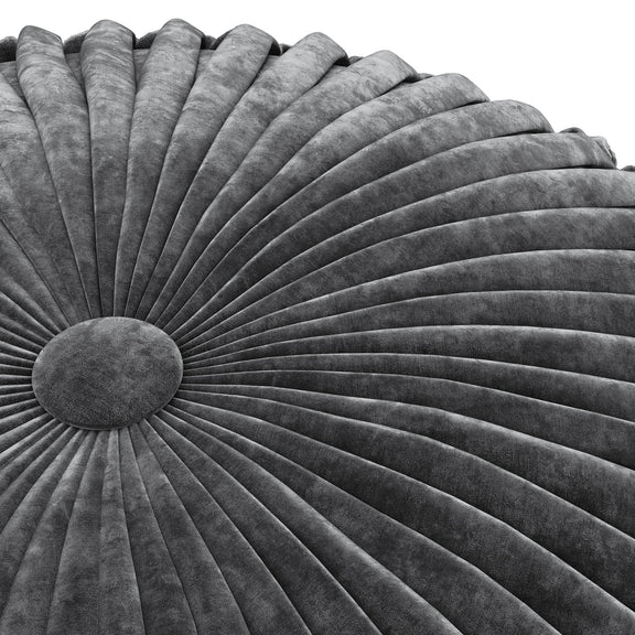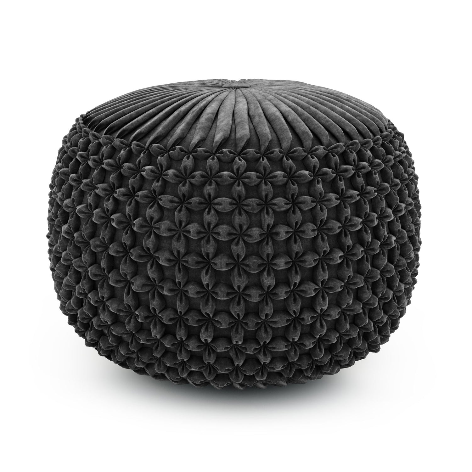 • Versatile round shape featuring a button tufted pleated top and unique tufted detail sides