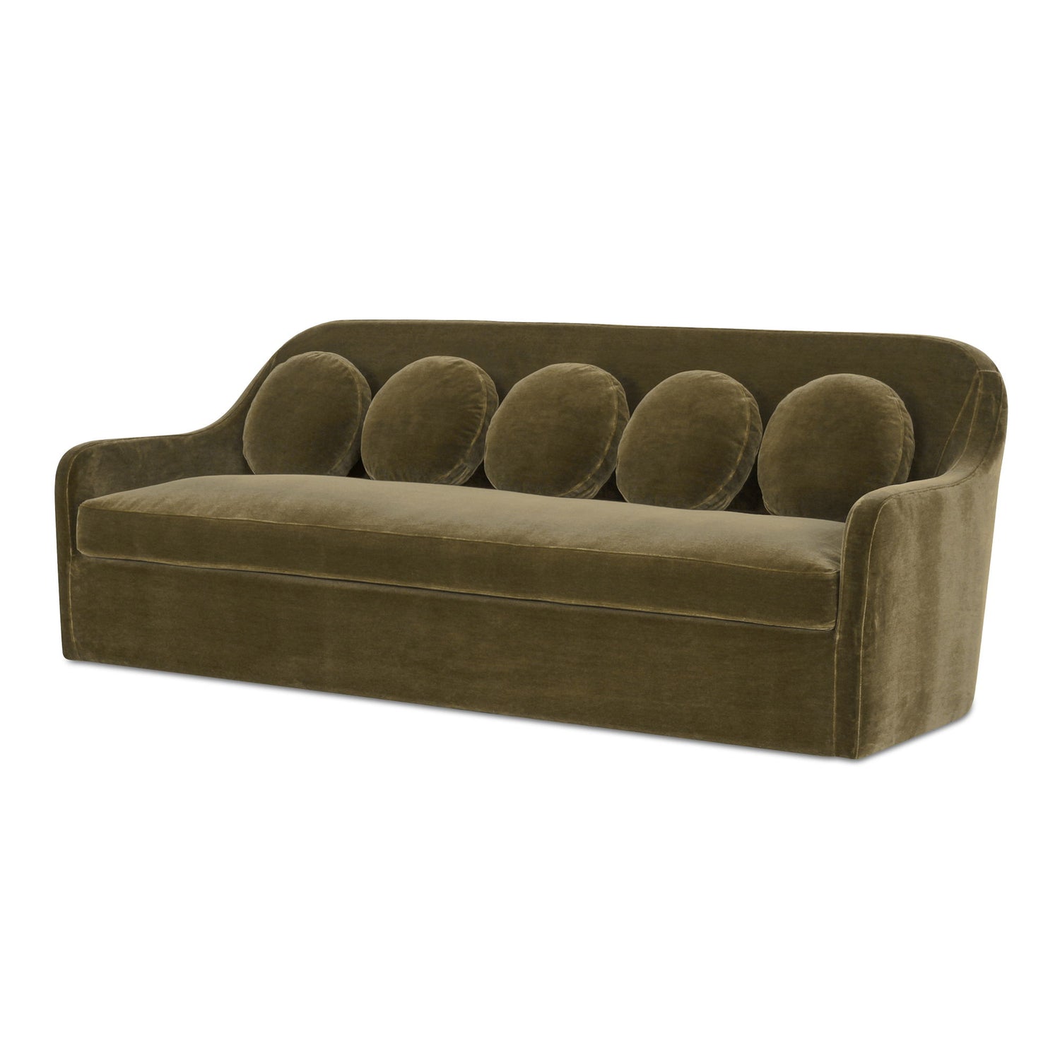 Gillian Segal for Moe's The Rialto sofa straddles the traditional and the contemporary, with mid-century inspiration through five playful, pancake-shaped pillows. An embrace of everyday living proportioned for relaxation, this piece features inviting round forms and durable, forgiving mohair upholstery, balancing playful sophistication and enduring elegance.