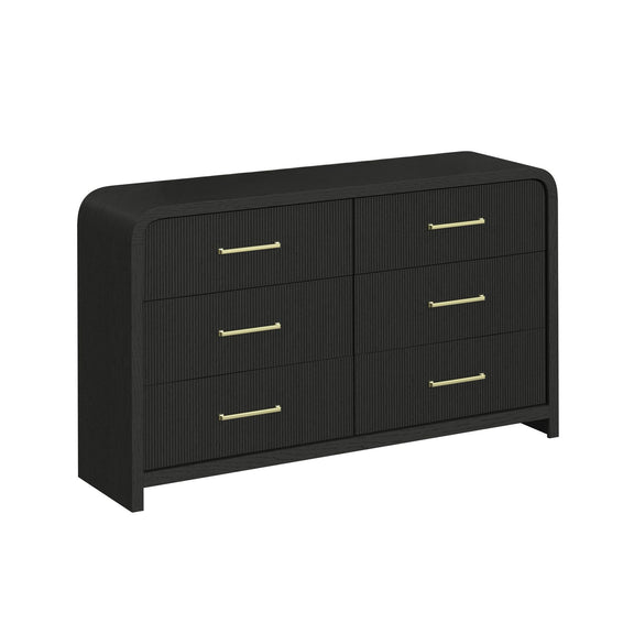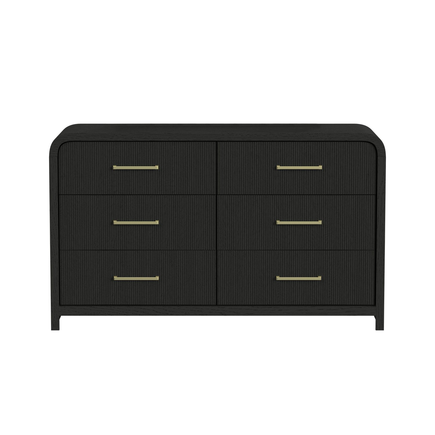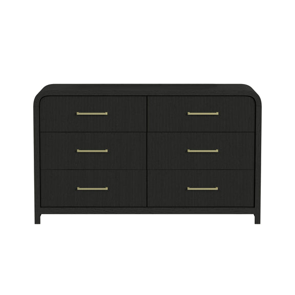 Enhance your bedroom with the stylish Ridgemont Dresser. Finished in a light wood with natural grain detailing, this piece brings warmth and elegance to any space. Sleek, rounded edges and vertical reeding throughout create a modern yet refined aesthetic. The dresser features a black felt-lined top drawer, providing protection and organization for your essentials. Spacious drawers, accented with bold black bar pulls, offer ample storage. With clean, minimalist lines, the Ridgemont Dresser combines function and contemporary design, making it an ideal addition to your bedroom.