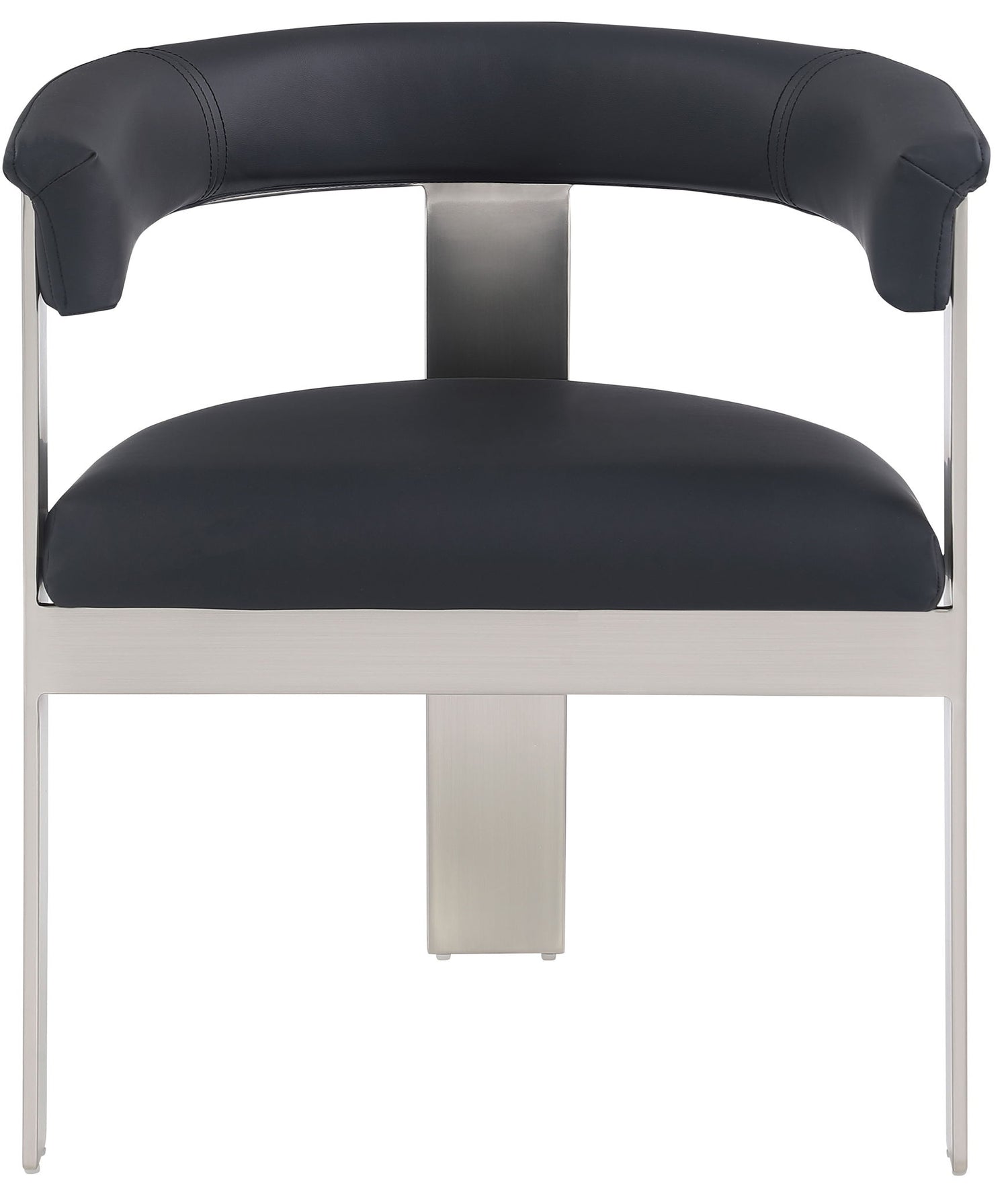 Enjoy an elevated dining experience when you bring home these Romeo vegan leather dining chairs, sold as a set of two. Featuring seats and backs upholstered in soft vegan leather, these chairs offer both style and comfort. The brushed chrome metal frames add a contemporary touch, making this pair of dining chairs a chic addition to your dining area. The curved backs provide not only a sleek look but also optimal support for the body, ensuring diners are relaxed from appetizers through dessert.