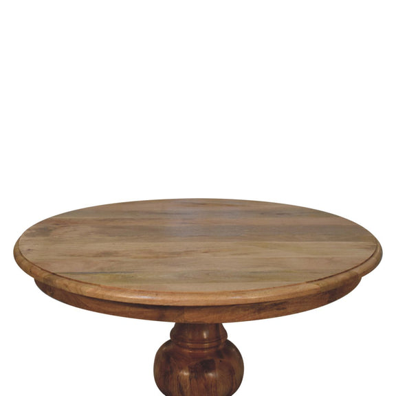 • Round Turned Dining Table - Create an elegant dining experience with this Round Turned Dining Table. Drawing inspiration from a classic French design it combines graceful curves with warm wood tones. Crafted from solid mango wood with an oak-ish finish this round table is the perfect piece for any dining room or kitchen. Every piece of furniture is individually handcrafted and includes swing care tickets explaining the cautions and aftercare instructions.