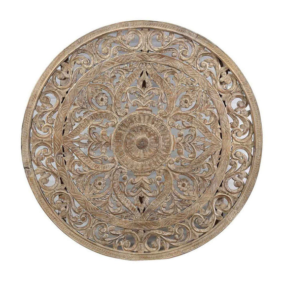 This intricately hand-carved round wall panel is a masterpiece of craftsmanship, radiating elegance and artistry. Its mandala-inspired design, with exquisite detailing and a distressed finish, highlights the natural beauty of reclaimed wood. Perfect as a focal point for any room, this stunning piece adds a touch of global charm and timeless sophistication to your décor.