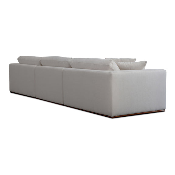 The Rue modular sectional features a generous 70% feather-fill topper within its bench seating, accompanied by toss cushions for an added layer of coziness. Its elegant silhouette is highlighted by a rubber wood base, creating a sleek floating appearance, all supported by subtle wooden legs. Designed with extreme comfort in mind, this modular embodies easy, neutral styling.