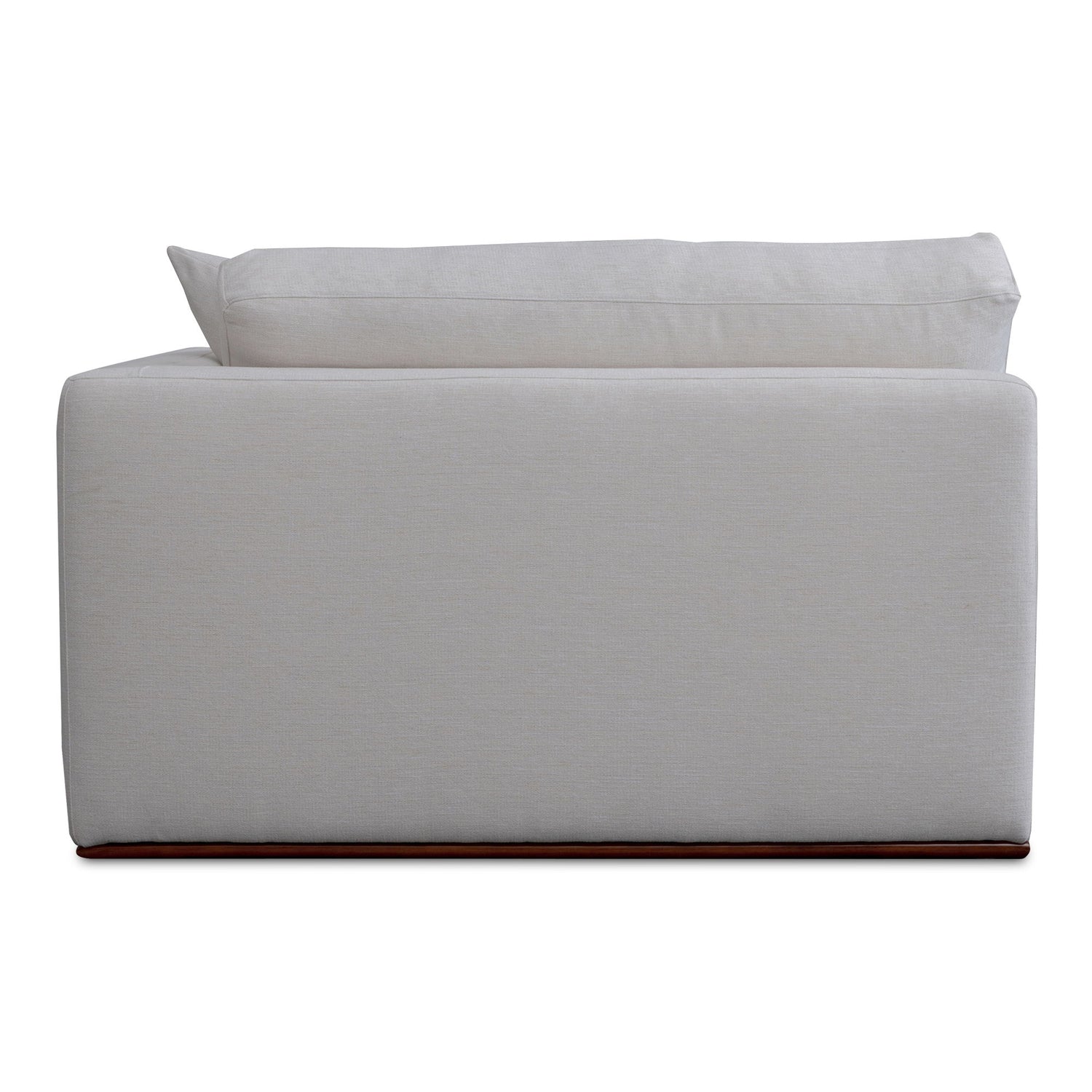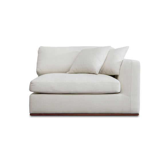 The Rue chair features a generous 70% feather-fill topper within its seat, accompanied by two toss cushions for an added layer of coziness. Its elegant silhouette is highlighted by a rubber wood base, creating a sleek floating appearance, all supported by subtle wooden legs. Designed with extreme comfort in mind, this modular chair embodies easy, neutral styling.