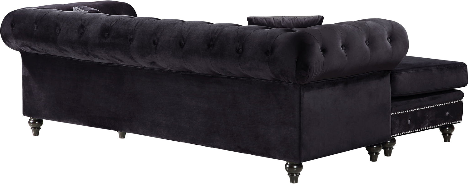 Lounge in luxurious style and comfort with this sleek Sabrina velvet reversible sectional. Featuring elegant, plush velvet upholstery and a deep tufted back, this sectional is a little piece of heaven for you to kick back and relax on. Double row nailheads give the sectional a contemporary element, and a reversible chaise offers a comfortable place to kick up your feet after a long day. Pillows are included as well to add to your comfort.