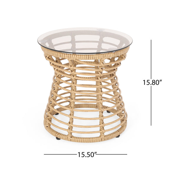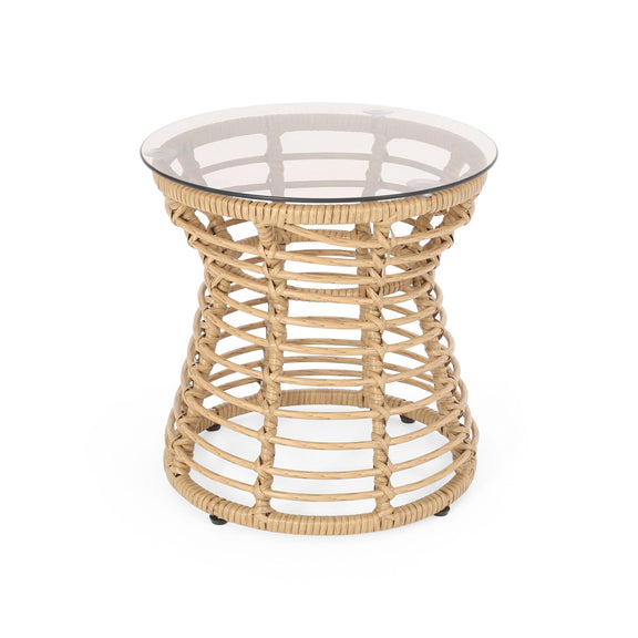 San Pedro - Boho Style Side Table With Tempered Glass Top - Light Brown Rattan