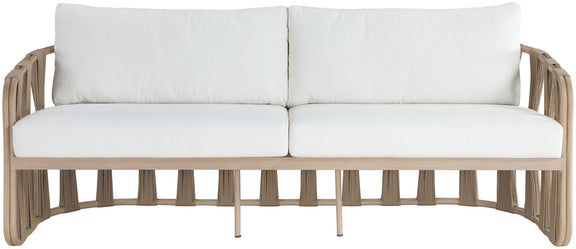 Woven polypropylene rope and resilient waterproof fabric give the San Pietro outdoor patio sofa a striking, art deco-inspired look. Wrapped in a natural aluminum teak frame, it's built to withstand the elements while maintaining its elegant appeal. Perfect for lounging outdoors, this piece blends sophisticated style with ultimate comfort.