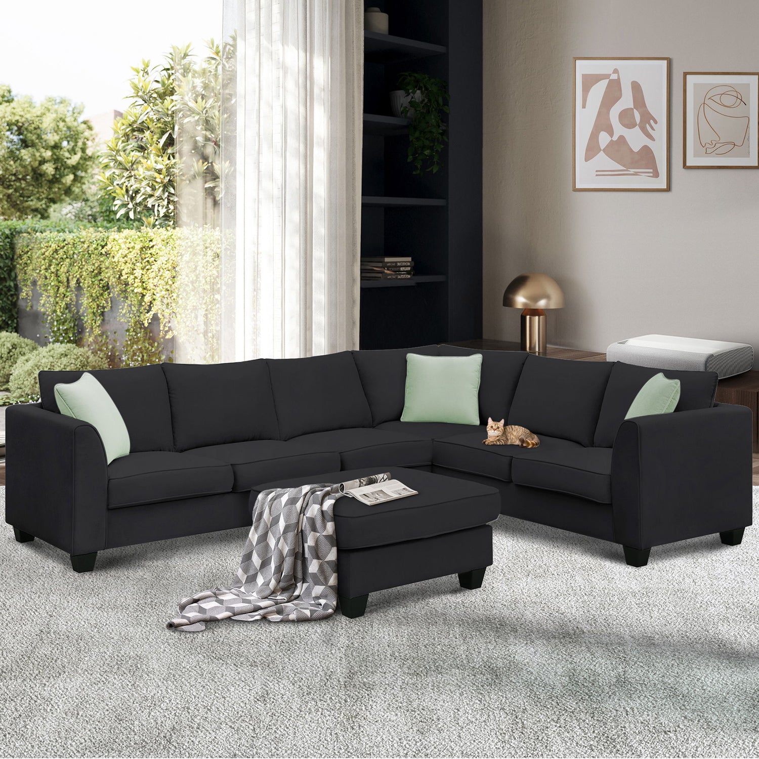 Sectional Sofa Couches Living Room Sets, 7 Seats Modular Sectional Sofa With Ottoman, L Shape Fabric Sofa Corner Couch Set With 3 Pillows - Black